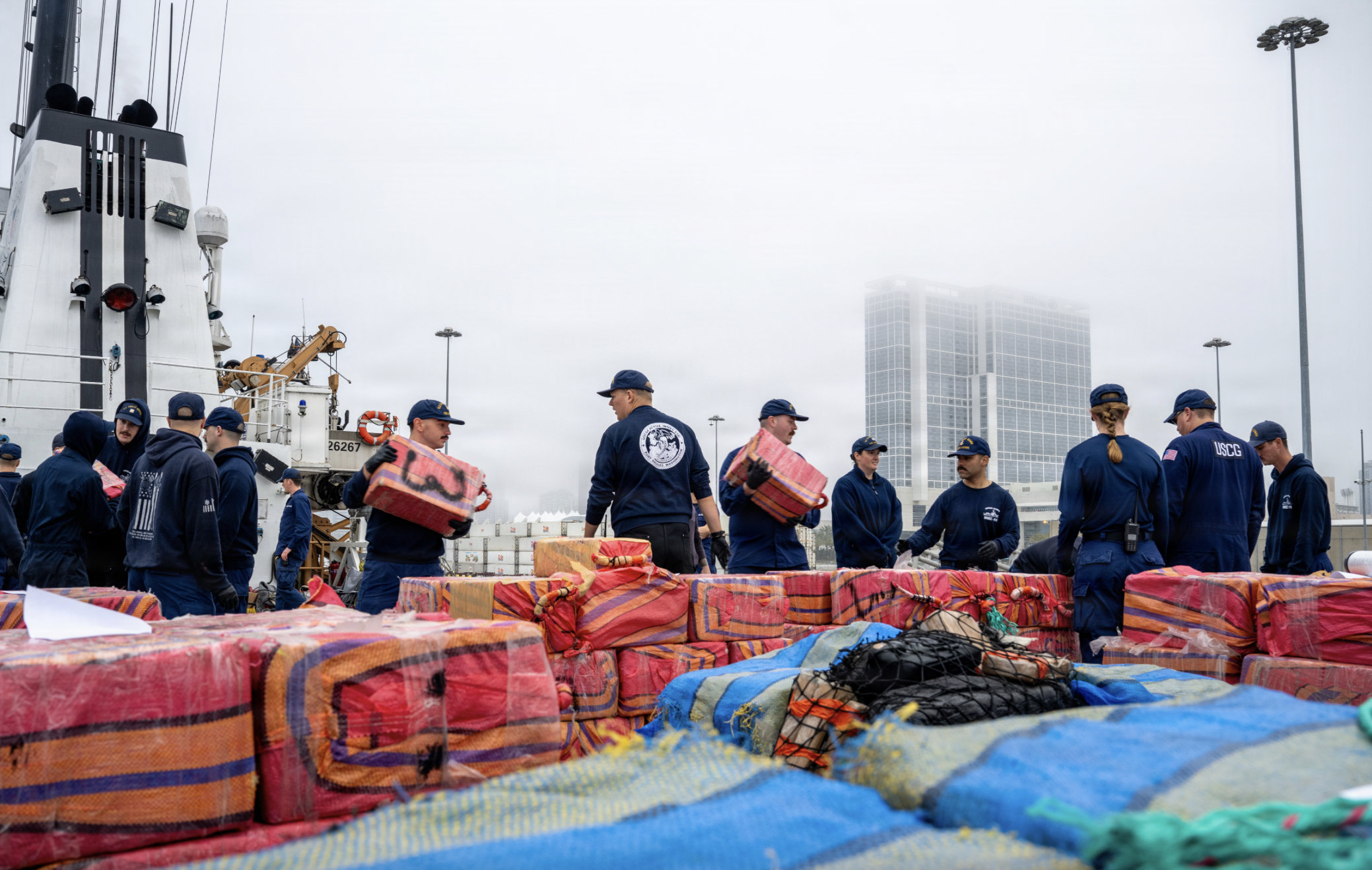U.S. Coast Guard Cutter Active (WMEC 618) crew members offload bales of seized cocaine in San Diego, Dec. 15, 2025. The drugs, worth $203.9 million, were seized in international waters of the Eastern Pacific Ocean. (U.S. Coast Guard photo by Petty Officer 1st Class Loumania Chenlo)