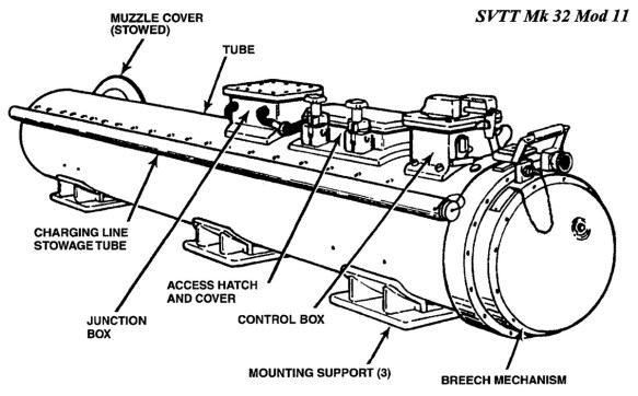 These systems are relatively small, 11’4″ in length and less than two feet wide. Loaded with a Mk46 torpedo, each tube weighs 1160 pounds. They do require 9’6″ of open space behind the breech for the tray used to load the 8’6″ long torpedo.