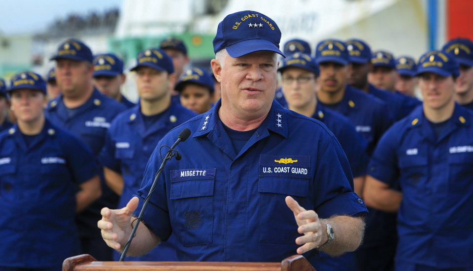 At Naval Base San Diego, Coast Guard Vice Admiral Fred Midgette, Commander, Pacific Area, Commander, Coast Guard Defense Force West answers questions during a press conference where he announced that 39,000 pounds of cocaine had been seized during the Coast Guard Cutter Waesche’s current deployment, Thursday, Oct. 27, 2016, in San Diego. The Coast Guard cutter on Thursday off-loaded narcotics that were confiscated in 25 separate busts that took place off the coasts of Central and South America over the past fiscal year. (Howard Lipin/The San Diego Union-Tribune via AP)