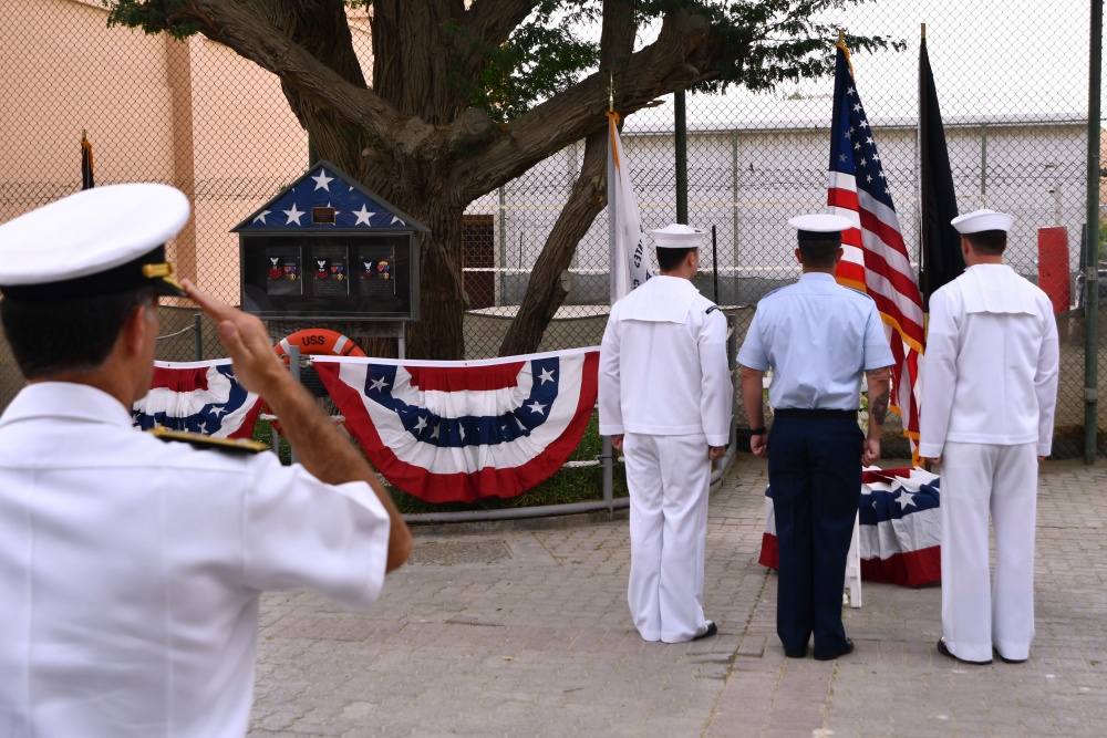 MANAMA, Bahrain (NNS) — Sailors and Coast Guardsmen gathered for a wreath laying memorial service and 5k run at Naval Support Activity Bahrain April 24 to remember and honor their fallen shipmates who made the ultimate sacrifice 14 years ago.