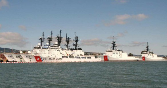 National Security Cutters Waesche and Bertholf (far right) moored at Coast Guard Island in Alameda, Calif., next to 378-foot Coast Guard Cutters Morgenthau (far left), Sherman and Boutwell, July 22, 2010. U.S. Coast Guard photo by Petty Officer 3rd Class Melissa Leake.