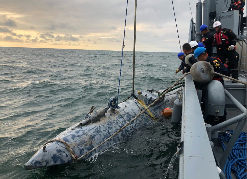 A Low Profile vessel (LPV) intercepted by the Colombian Navy in March may represent the first sighting of a new family of nacrosubs. The camouflaged vessel combines the once-standard layout of having the payload in the bow, cockpit amidships and single internally mounted engine in the stern with the recent trend to Very Slender Vessels. VSV-narcosubs started to be seen spring 2017 and have evolved into two distinct lineages, but all have featured aft-mounted cockpits and outboard motors. The boat is 20 meters long and just two meters wide giving a fineness ratio of 10:1.