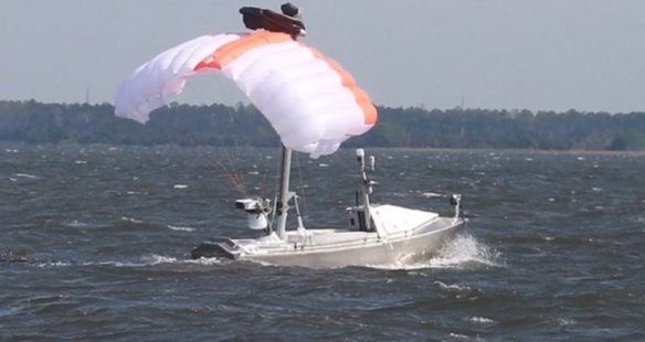 The Towed Airborne Lift of Naval Systems (TALONS) is a parafoil-based system shown kiting from the Greenough Advanced Rescue Craft. TALONS relays data between the MCM USV and the LCS via the government-developed multi-vehicle communication relays system. (Credit: US Navy/Released)
