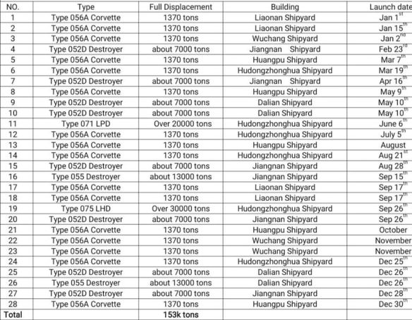 16 Type 056 corvettes, 8 Type 052D destroyers, two type 055 destroyer/cruisers, a Type 071 LPD, and a Type 075 LHD. 28 surface warships total. It is possible some of the Type 056s are intended for export or for the China Coast Guard.