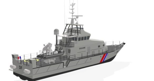A CGI of the OCEA FPB 100 MKII patrol boat ordered by the French Customs (Credit : OCEA) Note UAV landing area aft port side.