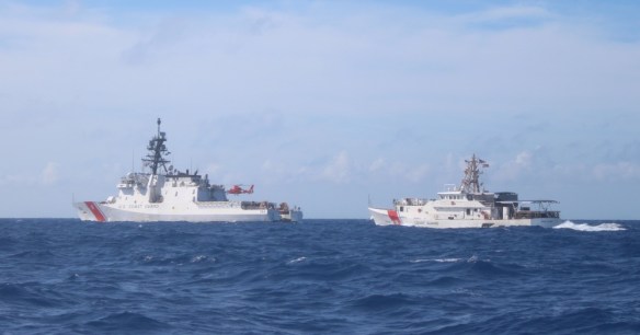 The Coast Guard Cutter James conducts Hurricane Dorian relief operations alongside the Coast Guard Cutter Paul Clark in the Caribbean Sea, Sept. 6, 2019. During their 62-day counter-drug patrol, the James’ crew, along with members from Tactical Law Enforcement Team-South, Helicopter Interdiction Tactical Squadron, Cryptologic Direct Support Element and multiple partner agencies, contributed to the interdiction of 7 drug-smuggling vessels and were responsible for the seizure of more than 12,677 pounds of cocaine and 4,085 pounds of marijuana bound for the United States. (U.S. Coast Guard photo courtesy of Coast Guard Cutter James)