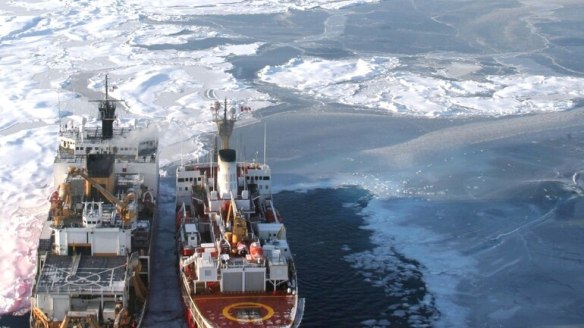 USCGC Healy and CCGC Louis S St-Laurent (Photo by Jessica Robertson, US Geological Survey)