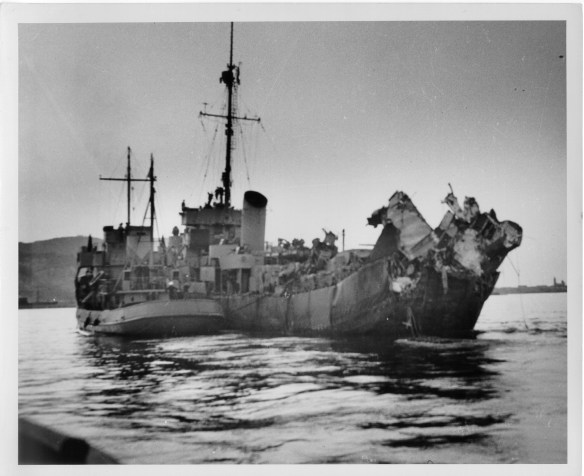 Coast Guard manned Destroyer Escort USS Menges, victim of a German Navy Acoustic Torpedo, 3 May, 1944