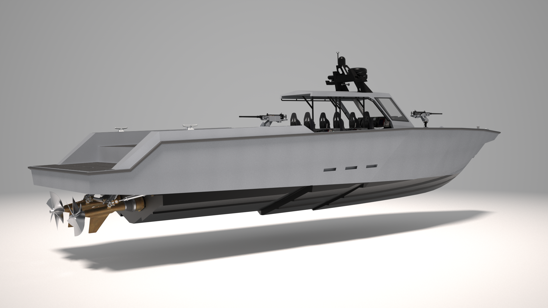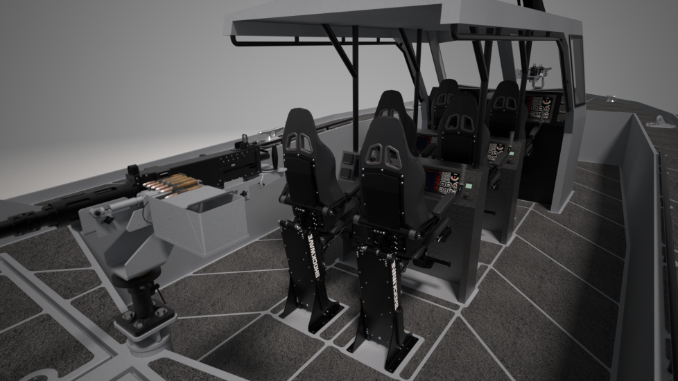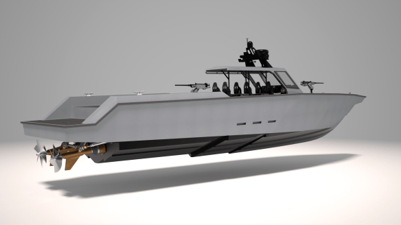 The first fifteen Super Interceptors are being built in a center console configuration with seating for six crew in Shockwave shock-mitigating seats beneath an integrated aluminum hard top. The vessels will be powered by twin 1,650-horsepower MAN 12-cylinder diesel inboard engines mated to Arneson ASD14 surface drives via ZF transmissions. Thus equipped, the Super Interceptor will reach a projected top speed in the 70-knot range. The vessel’s flexible configuration allows for a maximum fuel capacity of 1,000 gallons, which results in an incredible 12.5 hours endurance at 50 knots.