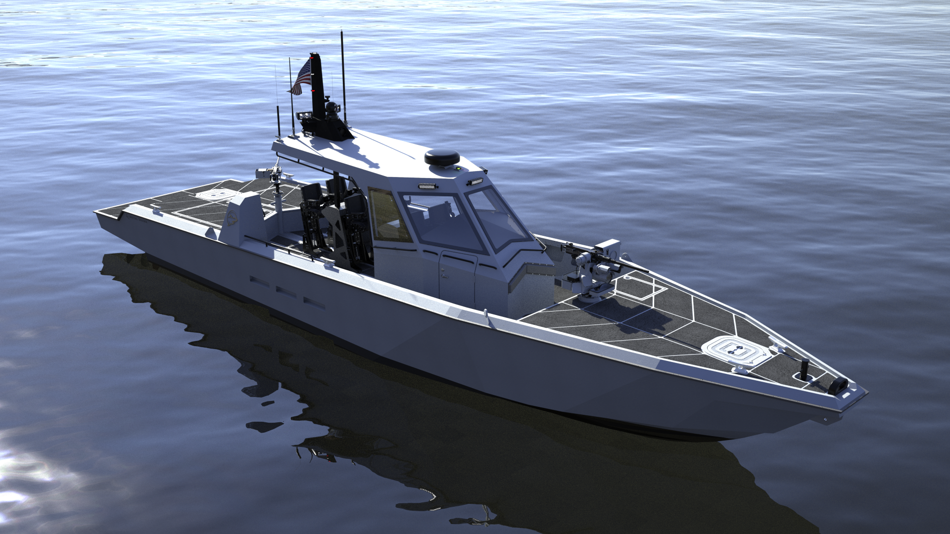 With an overall length of nearly 58’ (17.5 m), a beam of over 11’ (3.5 m) and an operational displacement of up to eight tons, the vessel is large and imposing. To satisfy modern military visual-deterrent requirements, the Super Interceptor boasts chiseled and menacing lines, including the distinctive “faceted hull” initially developed by Metal Shark for the US Navy and now being widely incorporated across Metal Shark’s product portfolio.