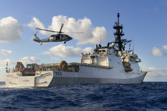 An MH-60S Knight Hawk Helicopter assigned to Helicopter Sea Combat Squadron (HSC) 21 conducts ‘touch and go’ drills aboard U.S. Coast Guard Legend-class cutter USCGC Munro (WMSL-755) during exercise Rim of the Pacific (RIMPAC) 2020 on Aug. 25, 2020. US Navy Photo