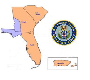 Georgia, Florida, the Caribbean, and Puerto Rico–Map: U.S.C.G. D7 Homepage (Area in blue is part of District 8. District 7/8 boundary in the Gulf of Mexico extends 199 degrees true from the coastal boundary to the Mexican coast–Chuck)