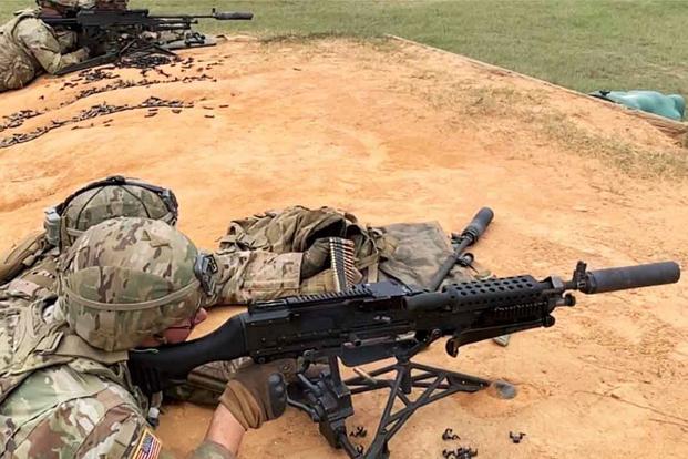 Soldiers at Fort Benning, Georgia live-fire testing a new suppressor from Maxim Defense on M240 Machineguns during Army Expeditionary Warrior Experiment (AEWE) 2021 which began in late October. (U.S. Army)