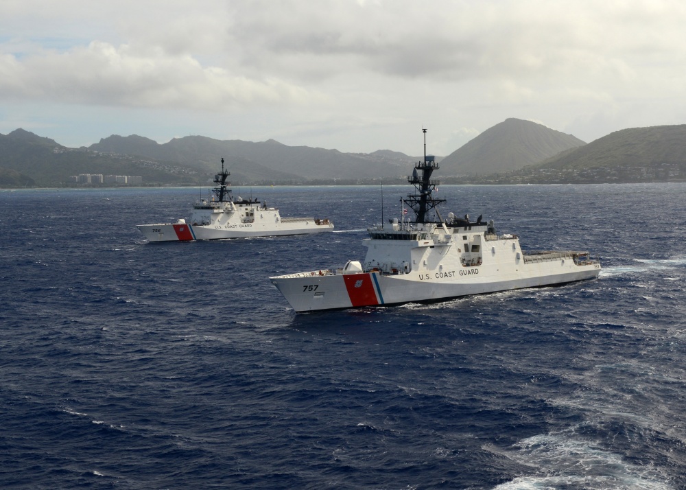 The crews of the Coast Guard Cutters Midgett (WMSL 757) and Kimball (WMSL 756) transit past Koko Head on Oahu, Hawaii, Aug. 16, 2019. The Kimball and Midgett are both homeported in Honolulu and two of the newest Coast Guard cutters to join the fleet. (U.S. Coast Guard photo by Petty Officer 3rd Class Matthew West/Released)