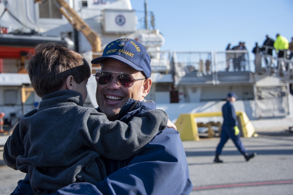 A Coast Guard Cutter Valiant crew member embraces his son Feb. 27, 2020, as he returns home to Naval Station Mayport, Florida. The Valiant crew returned home after completing a nine-week patrol in the Caribbean Sea supporting Joint Interagency Task Force South. (U.S. Coast Guard photo by Petty Officer 2nd Class Ryan Dickinson)