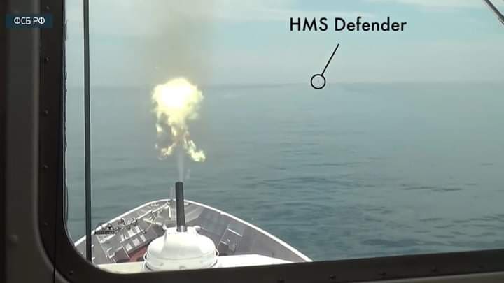 You have probably heard that HMS Defender was confronted by Russian military forces during a transit off Crimea. The Russians claim they dropped bombs in the path of the British Destroyer and that the Russian Coast Guard fired warning shots. The British say it did not happen. I can’t comment on the claim of bombs being dropped, but lets look at the evidence the Russians provided of warning shots, it the form of the photo above.