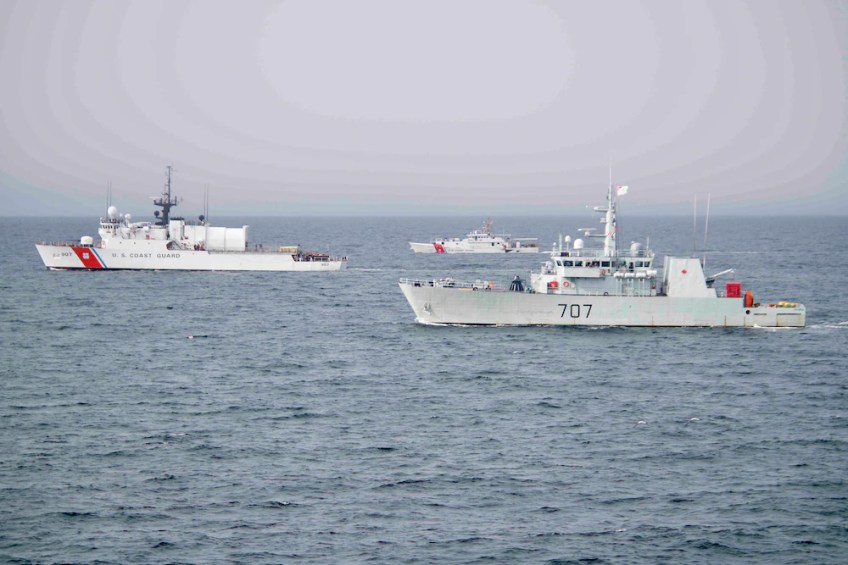 Courtesy Photo | USCGC Escanaba (WMEC 907) and USCGC Richard Snyder (WPC 1127) practice maneuvering with the Royal Canadian Navy’s HMCS Goose Bay (MM 707) in the Davis Strait on Aug. 13, 2021. In Operation Nanook, the U.S. Coast Guard seeks to work collaboratively with other international partners to enhance collective abilities to respond to safety and security issues in the High North through the air and maritime presence activities, maritime domain defense, and security exercises. (Photo courtesy Royal Canadian Navy)