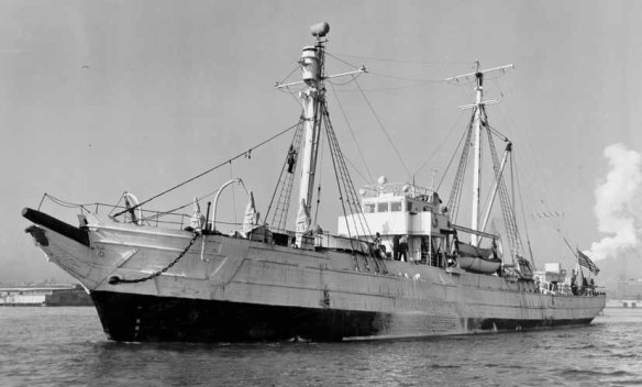 Appearing very different from its last Greenland visit in 1884, the USS Bear returned in 1944. Unlike in 1884, the Bear relied on a Coast Guard crew during World War II. As part of the Greenland Patrol, it cruised Greenland’s waters and, in October 1941, brought home the German trawler Buskø, the first enemy vessel captured by the U.S. in WWII. (Coast Guard photo)
