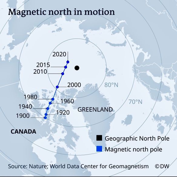 This was just too interesting not to post. Based on what I see here, Magnetic North has moved over 1200 nautical miles (2222 kM) since 1900, or about 10 nautical miles a year. It is no longer in Canada. Looks like the movement may be accelerating. A North South reversal is over due. Probably no reason to be alarmed.