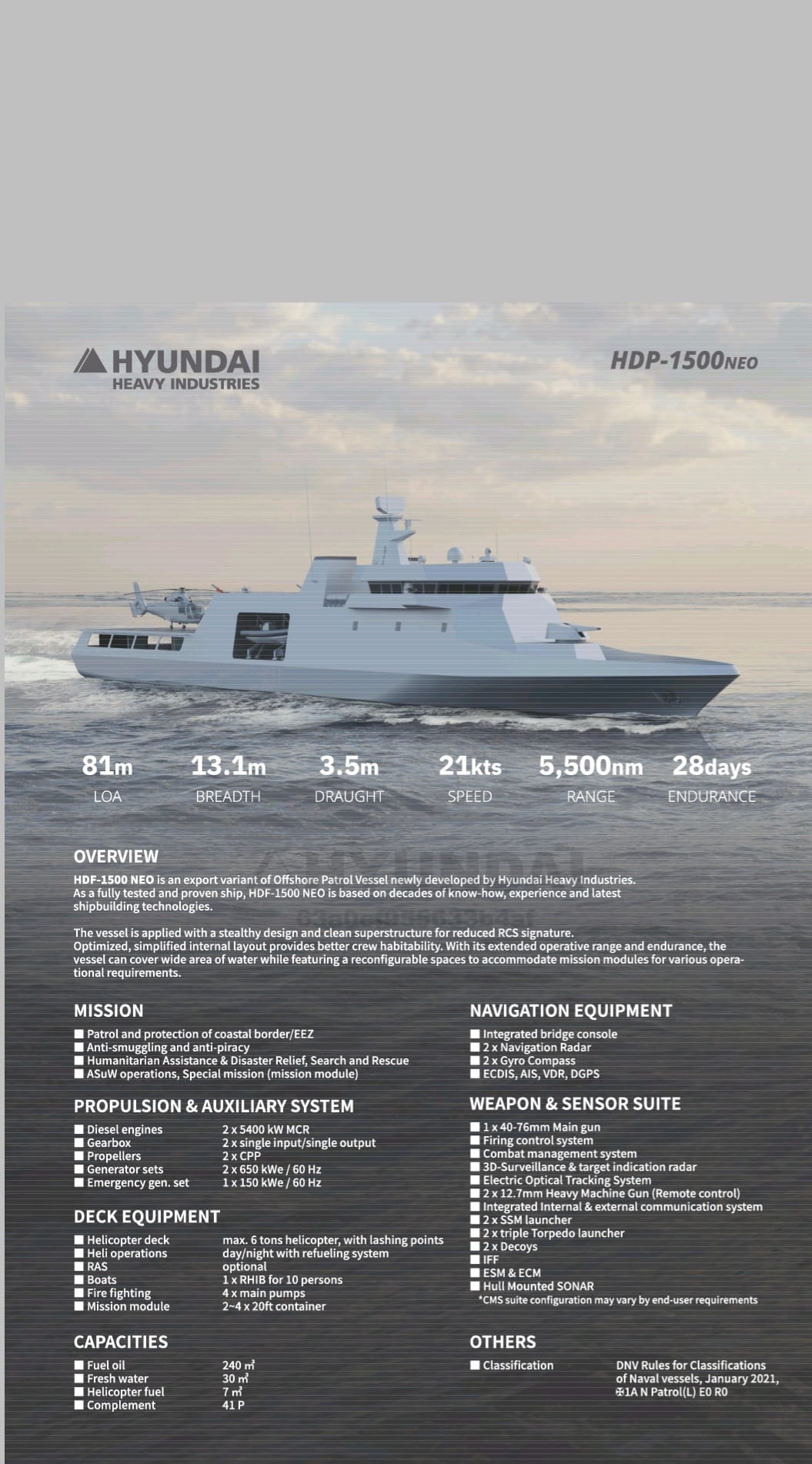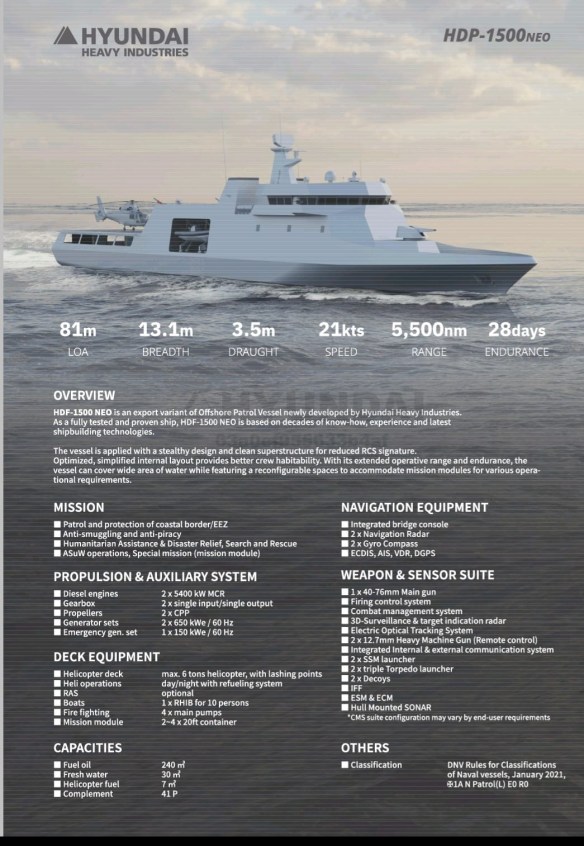 The Philippine News Agency has announced that Hyundai has been selected to build six Offshore Patrol Vessels for the Philippine Navy. There isn’t much detail about how they are to be equipped. The list below are just options. A length of 81 meters works out to 266 feet.