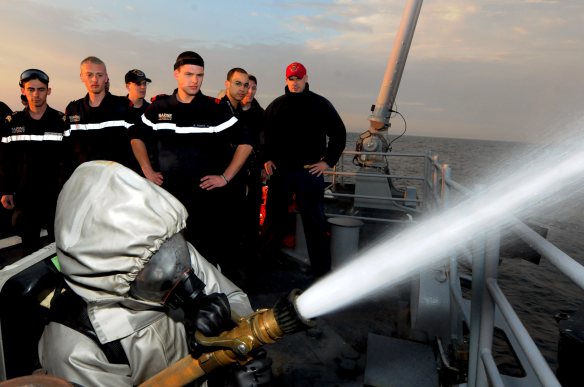 Thinking about uniforms, I would like to point out a feature I like, on the French Navy’s work uniform. That is the bright stripe that appears to be reflective on the upper part of the uniform. In the case of a man over board or an abandon ship, this could mean the difference between being found or missed. It is also probably more visible in a smoke filled compartment.