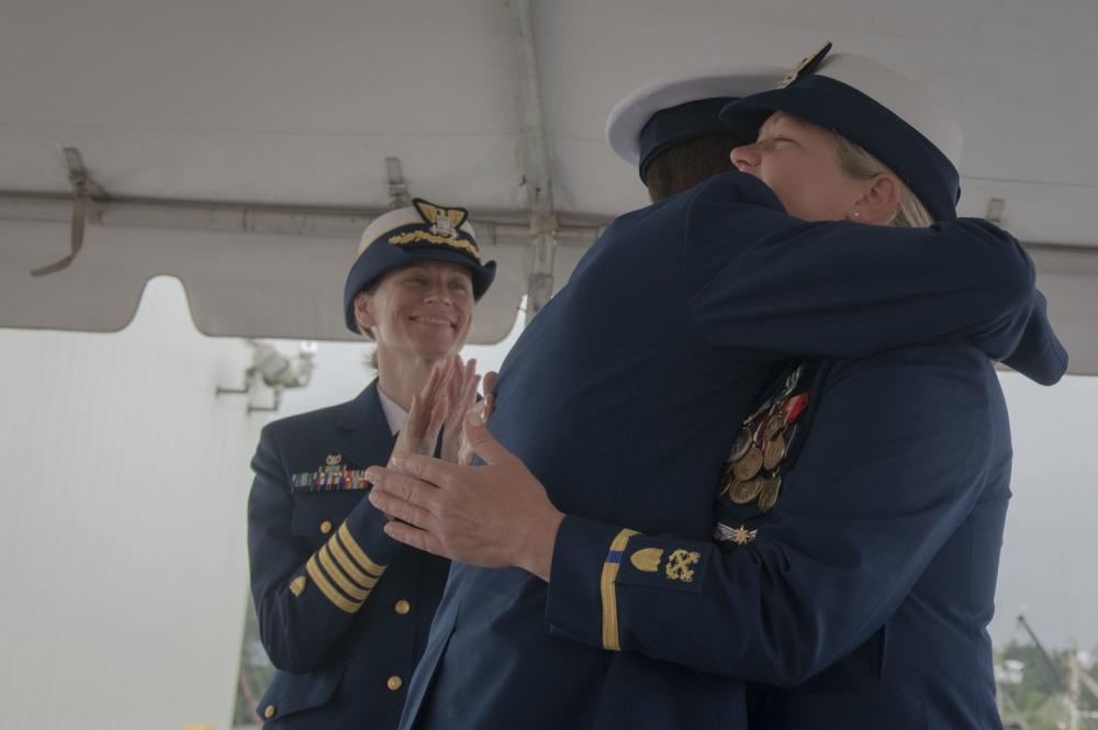 Capt. Breanna Knutson (left), commander, Coast Guard Sector North Bend, claps as Master Chief Scott Slade (middle) embraces his wife Chief Warrant Officer Beth Slade (right) during a change of command ceremony at Coast Guard Station Coos Bay in Coos Bay, Oregon, June 10, 2022. The Coast Guard spouses are both surfmen. (U.S. Coast Guard Photo by Petty Officer 3rd Class Diolanda Caballero)