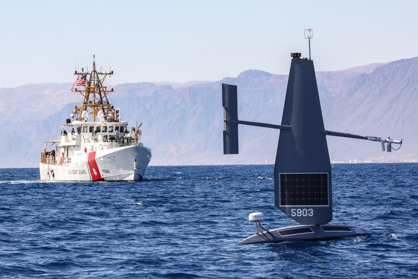 GULF OF AQABA (Feb. 13, 2022) The U.S. Coast Guard Sentinel-class cutter USCGC Glen Harris (WPC 1144) sails near a U.S sail drone explorer during the International Maritime Exercise/Cutlass Express (IMX) 2022, Feb. 13, 2022. IMX/CE 2022 is the largest multinational training event in the Middle East, involving more than 60 nations and international organizations committed to enhancing partnerships and interoperability to strengthen maritime security and stability. (U.S. Army photo by Cpl. DeAndre Dawkins)