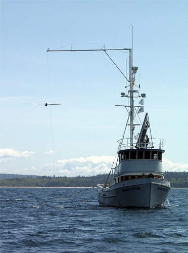 Scan Eagle approaching a ship for its first autonomous recovery, using the Skyhook system. This shows how even very small ships can operate these systems.