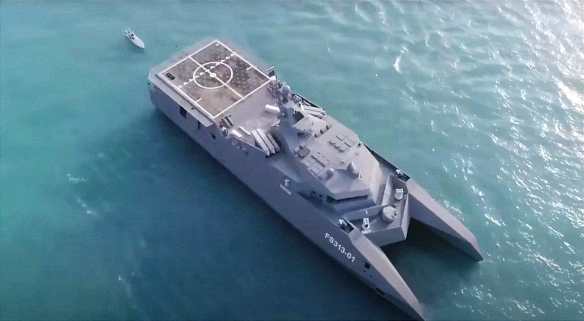 When engaged in force protection, if the force protection package includes aircraft, and one of this class shows up, a PATFORSWA Webber cutter class might be doing useful service, if they take station a couple hundred yards behind the corvette and maintain a fire control solution on that probably highly flammable and explosive collection of weapons in the center of the superstructure, behind the bridge–without pointing the gun, of course.