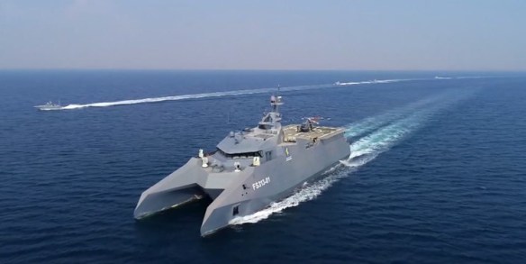 Covert Shores reported on new Iranian missile armed catamaran corvettes, but the report also included the photo above. What we are seeing is a boat suspended from the stern of the corvette. The boat is equipped with what appears to be a torpedo tube for a lightweight torpedo. Presumably there is a second tube on the other side. Diameter is likely to be the same as the NATO standard, 324mm or 12.75″. Unlike most lightweight torpedoes, this is unlikely to be intended for use against submarines. Almost certainly, it is intended for use against surface ships.