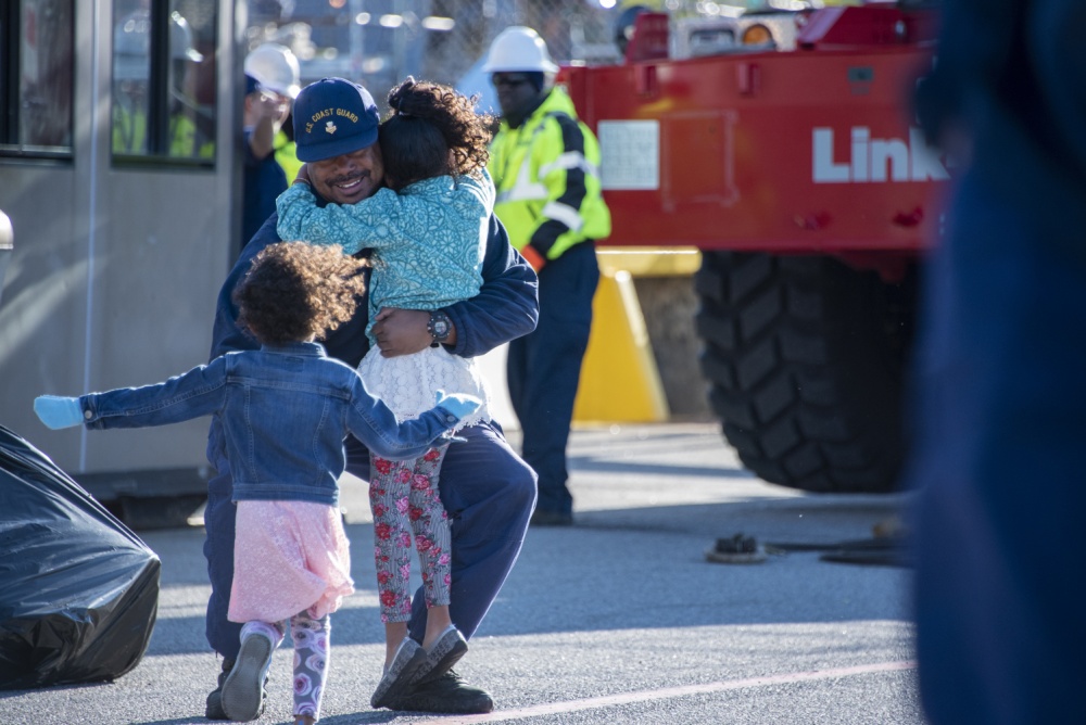 A Coast Guard Cutter Valiant crew member embraces his family Feb. 27, 2020, as he returns home to Naval Station Mayport, Florida. The Valiant crew returned home after completing a nine-week patrol in the Caribbean Sea supporting Joint Interagency Task Force South. (U.S. Coast Guard photo by Petty Officer 2nd Class Ryan Dickinson)