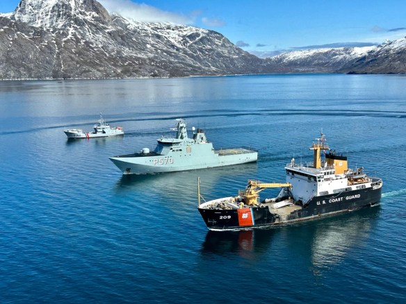 The USCGC Sycamore (WLB 209) crew participates in a navigation exercise with HDMS Knud Rasmussen (P570), a Royal Danish Navy Knud Rasmussen-class patrol vessel and the FNS Fulmar (P740), a French Navy patrol vessel, off the coast of Southern Greenland, June 13, 2023. Deployed forces demonstrated U.S. Coast Guard capabilities to build partner capacity and expertise in search and rescue, navigation, and damage control. These efforts solidify key strategic relationships while achieving mutual Danish, Greenlandic, and U.S. goals in the North American Atlantic Arctic and Northwest Atlantic Ocean. (U.S. Coast Guard photo by Lt. Cmdr. Katherine Blue)