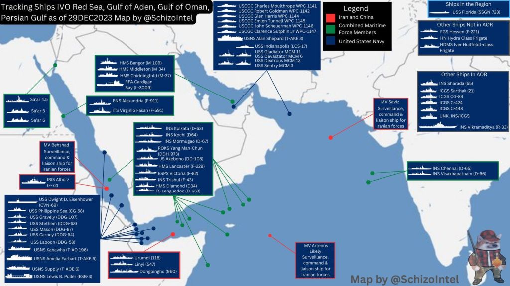 5 thoughts on “Tracking Naval Forces Red Sea, Gulf of Aden, Gulf of Oman, and Persian Gulf –25 Dec, 2023