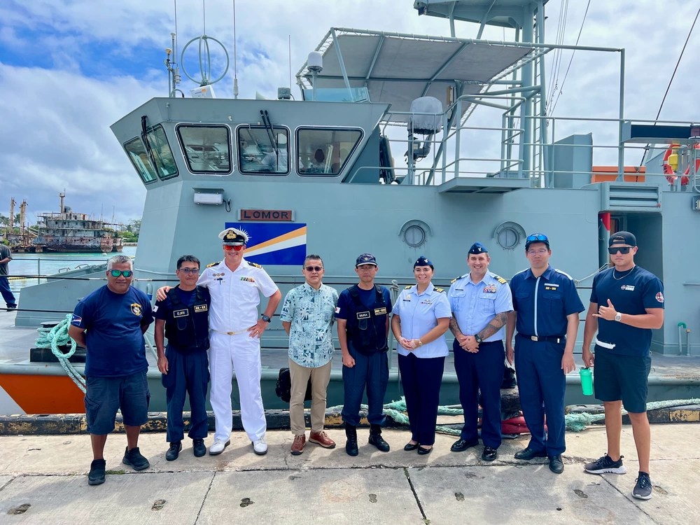 In Majuro, Republic of the Marshall Islands, on Jan. 26, 2024, U.S. Coast Guard Forces Micronesia/Sector Guam’s Cmdr. Ryan Crose, response department head, and Lt. Cmdr. Christine Igisomar, COFA maritime advisor, stand for a photo with Lt. Cmdr. Lachlan Sommerville, the Royal Australian Navy’s Maritime Security Advisor to the RMI Sea Patrol, and members of the RMI Sea Patrol. This visit marks a continuation of efforts to enhance the U.S. Coast Guard’s positive relationship with the Marshall Islands, particularly its maritime law enforcement entity, the RMI Sea Patrol. (U.S. Coast Guard photo)