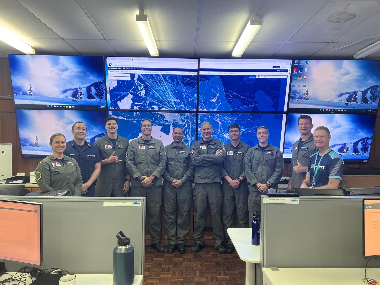 U.S. Coast Guard personnel from District Fourteen and Air Station Barbers Point pose for a photo with a member of the Royal New Zealand Air Force and Forum Fisheries Agency at the Regional Fisheries Surveillance Centre (RFSC) in Honiara, Solomon Islands, Aug. 13, 2024. An HC-130 Hercules airplane crew from Air Station Barbers Point toured the RFSC as part of their participation in Operation Island Chief, during which they searched over 232,100 square miles in the South Pacific to detect any illegal, unreported and unregulated fishing activity. (U.S. Coast Guard courtesy photo)