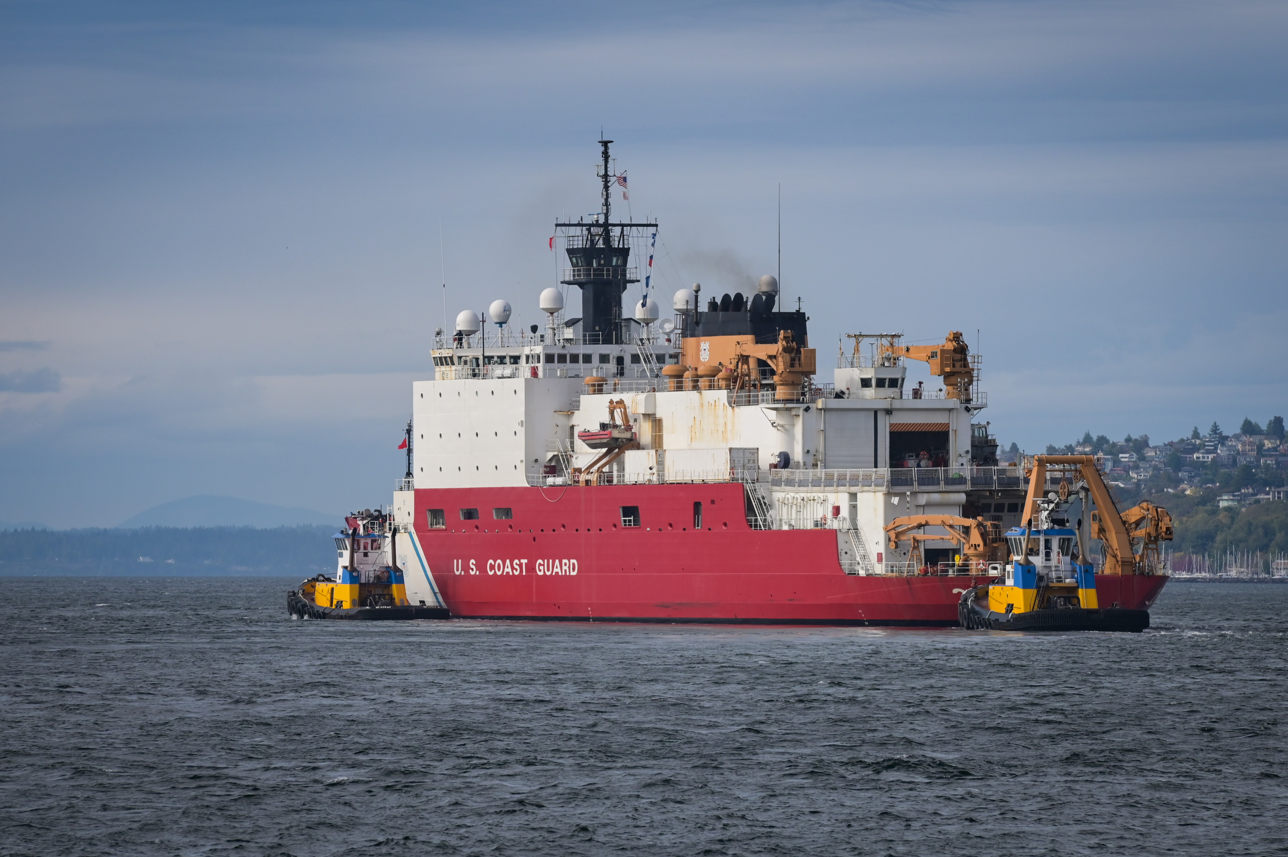 U.S. Coast Guard Cutter Healy (WAGB 20) transits with assist tugs through Elliott Bay near Seattle following its departure from Base Seattle, Oct. 1, 2024. The crew of the Healy are scheduled to resume their scientific mission that was cut short due to an onboard fire in late July. (U.S. Coast Guard photo by Petty Officer 1st Class Steve Strohmaier)
