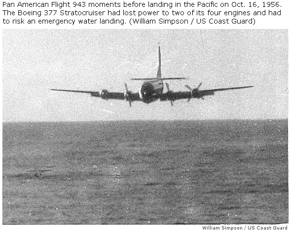 Pan Am Flight 6 ditching in the Pacific Ocean, photographed from US Coast Guard Cutter Pontchartrain. Note that engine #4 appears to be feathered.