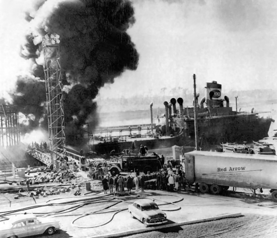 “… foam to fight was on its way. At about 7:00 A.M. the U.S. Air Force at Ellington Air Force Base sent ten 55-gallon drums of foam to the scene and another ten barrels at 9:30 A.M. The Coast Guard Houston Port Captain, with approval from the Eighth Coast Guard District office in New Orleans, bought more chemical foam from commercial sources. A veritable air lift was begun to bring foam into Houston through Ellington Air Force Base with the first plane in the airlift arriving at Ellington at 11:59 A.M. Later that afternoon Air Force and Navy aircraft arrived with foam at almost ten minute intervals. This foam air lift continued for seven hours, stopping at about 7:00 P.M. when the Houston Civil Defense spokesman advised no further need for foam. The fire had been brought for the second–but final– time under control. This foam air lift consisted of 47 flights, hauled more than a half million pounds of foam, involved more than 400 Air Force and Navy personnel, and used some 42 Air Force and Navy vehicles.”