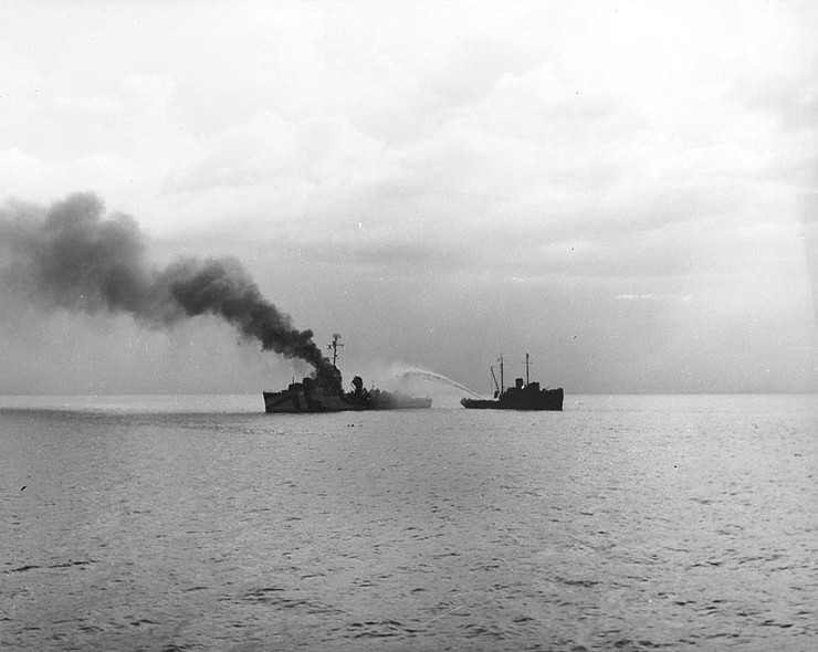 USS Lamson (DD 367) on fire in Ormoc Bay on 7 December 1944, after she was hit by a kamikaze. The tug assisting with firefighting is probably ATR-31.