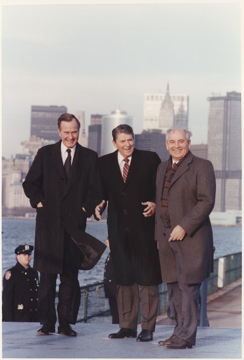 President Ronald Reagan and President-elect George Bush meet with Soviet leader Mikhail Gorbachev on Governor’s Island, December 1988