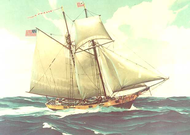 Contemporary painting of a Revenue Marine cutter, which may be of either the Massachusetts (1791), or its replacement, the Massachusetts II. Description from the United States Coast Guard website: “This painting purports to illustrate the first cutter named Massachusetts but it incorrectly shows the cutter flying the Revenue ensign and commission pennant, which were not adopted until 1799, well after the first Massachusetts had left service. Nevertheless, the illustration does show those characteristics typical of most of the first few generations of Revenue cutters: a small sailing vessel steered by a tiller, with low freeboard, light draft, lightly armed, and usually rigged as a topsail schooner.”