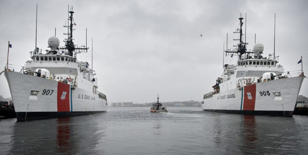 A Coast Guard Station Boston crew transits between Coast Guard Cutter Escanaba and Coast Guard Cutter Spencer in Boston on Nov. 24, 2014. The Escanaba and Spencer are 270-foot Famous-class medium endurance cutters. U.S. Coast Guard / Petty Officer 3rd Class MyeongHi Clegg