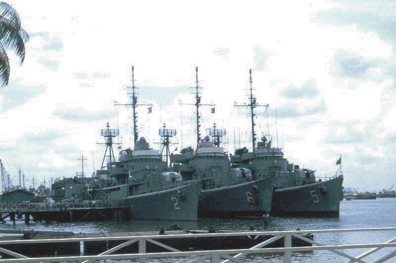 RVNS Tran Binh Trong (HQ-5) es-USCGC Castle Rock moored outboard of ex-USCGC Cook Inlet (WHEC-384) in South Vietnamese naval service as RVNS Tran Quoc Toan (HQ-6) and ex-USCGC Bearing Strait (WHEC-383) in South Vietnamese naval service as RVNS Tran Quang Khia (HQ-2) at Saigon in May 1972.