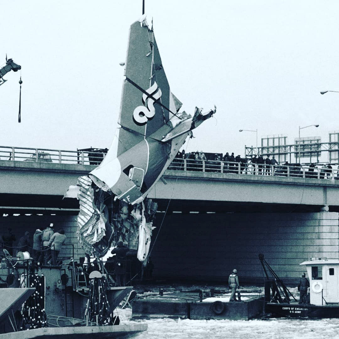1982 Air Florida Flight 90 crashed onto the 14th Street Bridge and then into the Potomac River in Washington, D.C., during a heavy snow storm. Coast Guard units, including cutters Capstan and Madrona, divers from the Atlantic Strike Team, a helicopter from AIRSTA Elizabeth City, personnel from Curtis Bay, and reservists from Station Washington assisted in the rescue of the five surviving passengers and the recovery of the aircraft’s wreckage. The plane crushed several cars on the bridge. All told seventy-four persons lost their lives.