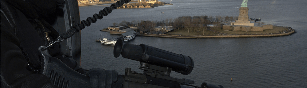 HITRON member from Jacksonville, Fla., mans an M-240 machine gun on board a Stingray MH-68A helicopter during a homeland security patrol around New York City
