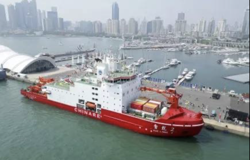 Aerial view of China’s icebreaker Ji Di berthing at the pier of Qingdao Olympic Sailing Center on July 3 in Qingdao, Shandong Province of China.