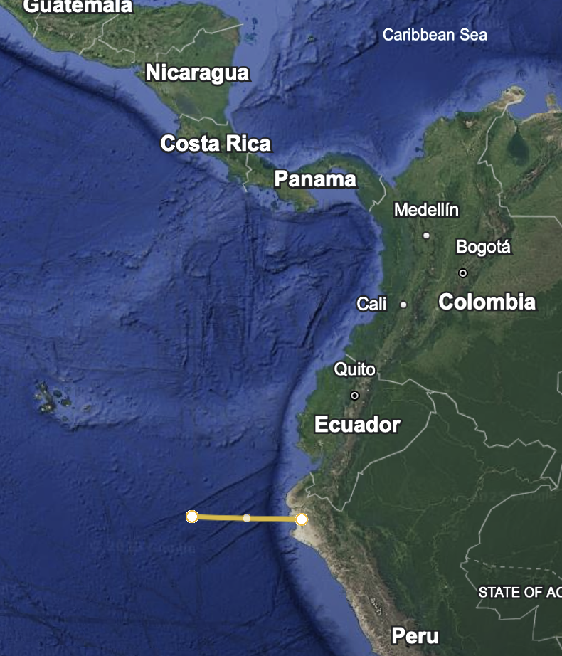 - I have been surprised in both reports by how far offshore and how far South go-fast boats are being intercepted. In this report, all James’ intercepts were more than 200 miles off shore, including a report of multiple go-fast boats 380 miles off the coast of Peru. In the USCGC Stone report, an intercept was made 715 miles from shore. The screen grab below is from Google Earth. The line extending West from Peru is 500 km in length, about 270 miles. The Galápagos Islands can be seen near the left edge. They are 900 km (486 nautical miles) West of mainland Ecuador.