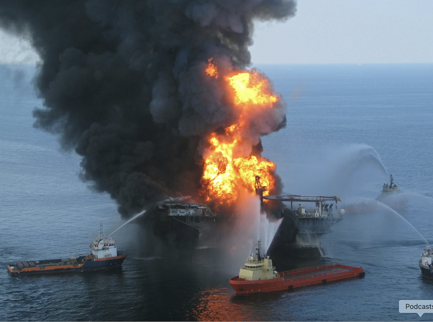 Platform supply vessels battle the blazing remnants of the off shore oil rig Deepwater Horizon. A Coast Guard MH-65C dolphin rescue helicopter and crew document the fire aboard the mobile offshore drilling unit Deepwater Horizon, while searching for survivors. Multiple Coast Guard helicopters, planes and cutters responded to rescue the Deepwater Horizon’s 126 person crew. 20 April 2010. US Coast Guard photo.