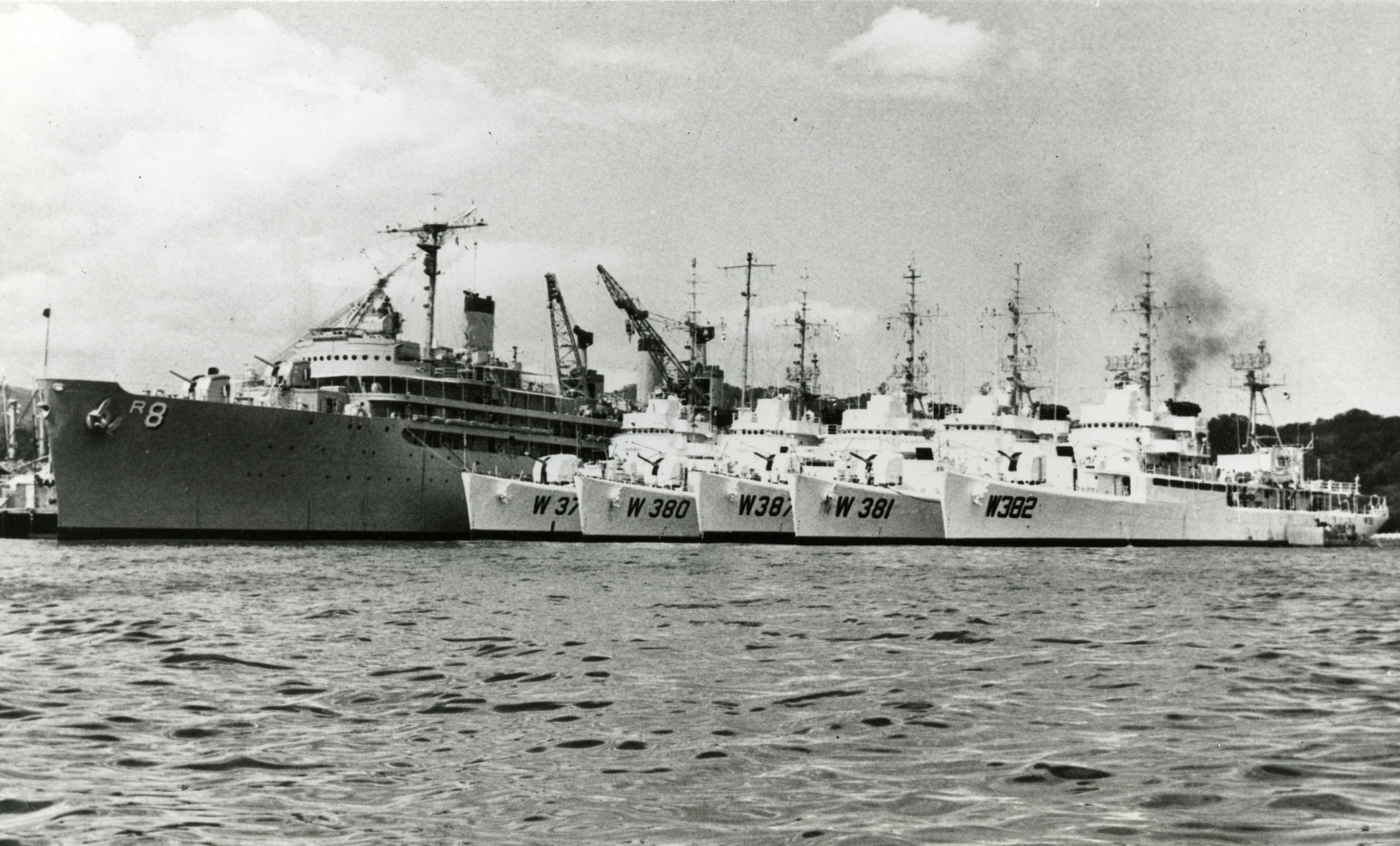 Squadron Three in Subic Bay, WHECs Half Moon (W378), Yakutat (W380), Barataria (W381), Bering Strait (W382), and Gresham (W387) along side repair ship USS Jason (AS-8).