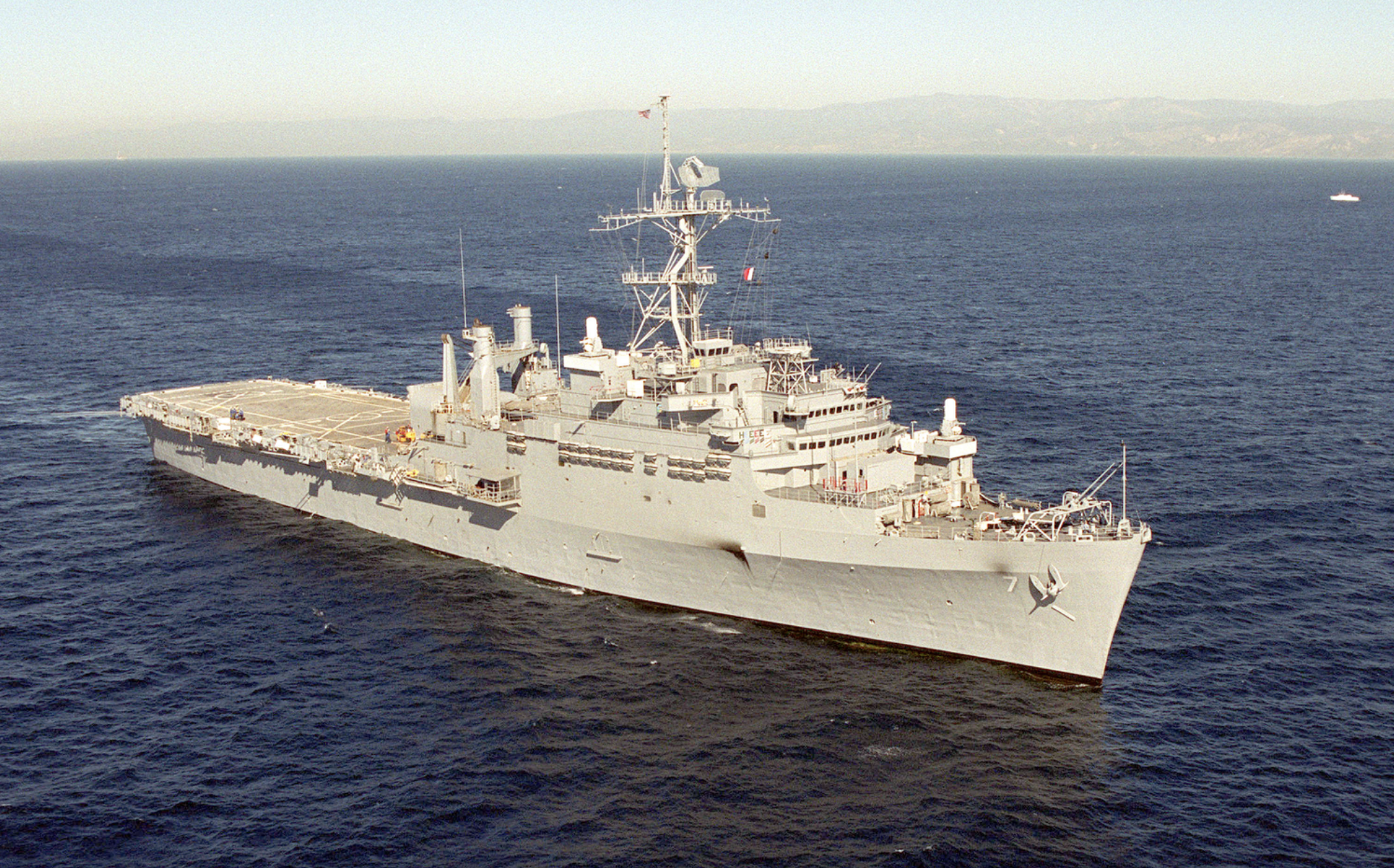 The U.S. Navy amphibious transport dock ship USS Cleveland (LPD-7) underway off the coast of Port Hueneme, California (USA), on 3 February 2000, in support of search and recovery operations for Alaska Airlines Flight 261.